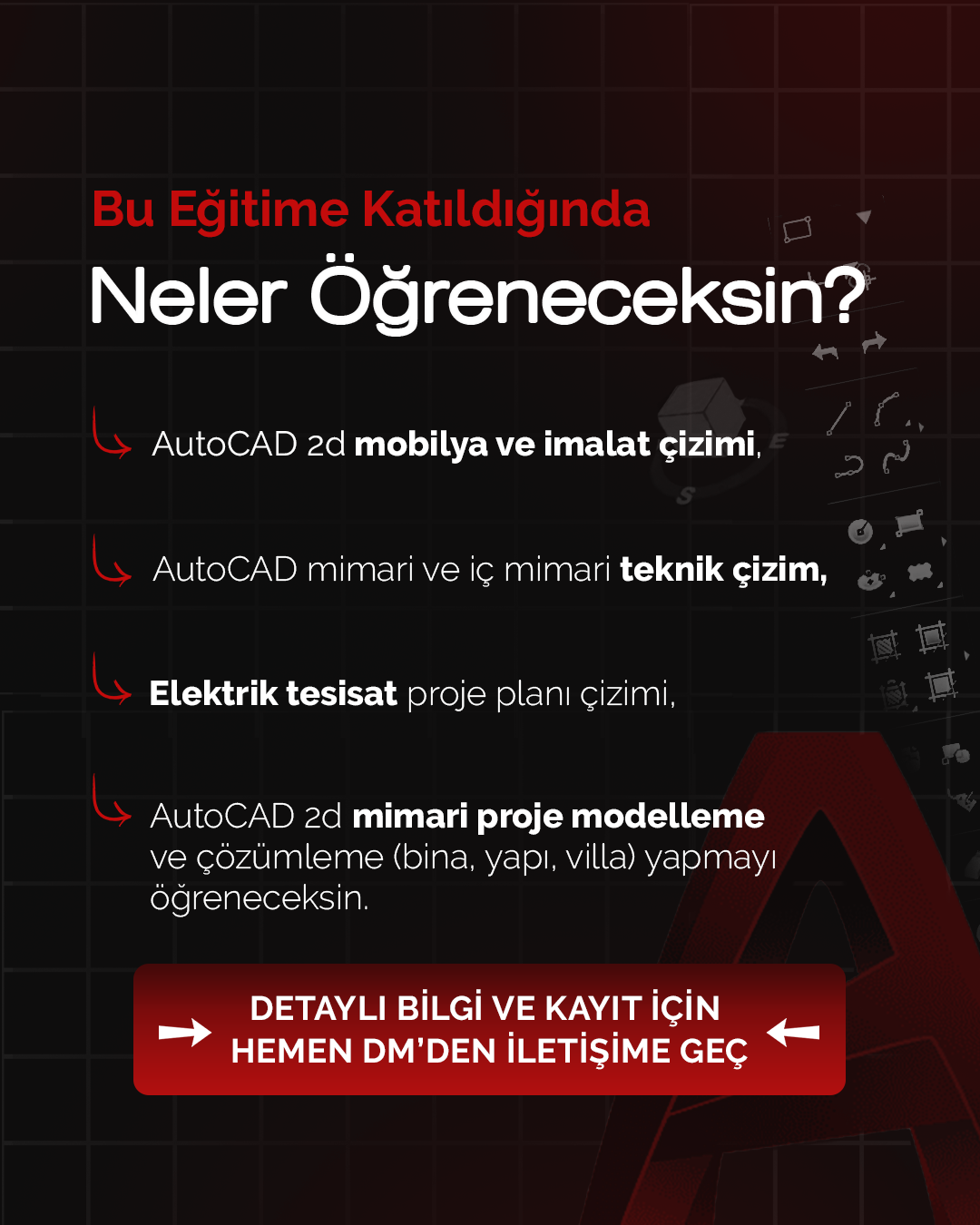 1-AutoCAD üzerinde temel seviyeden başlayarak ileri seviye çizim yapmayı.
